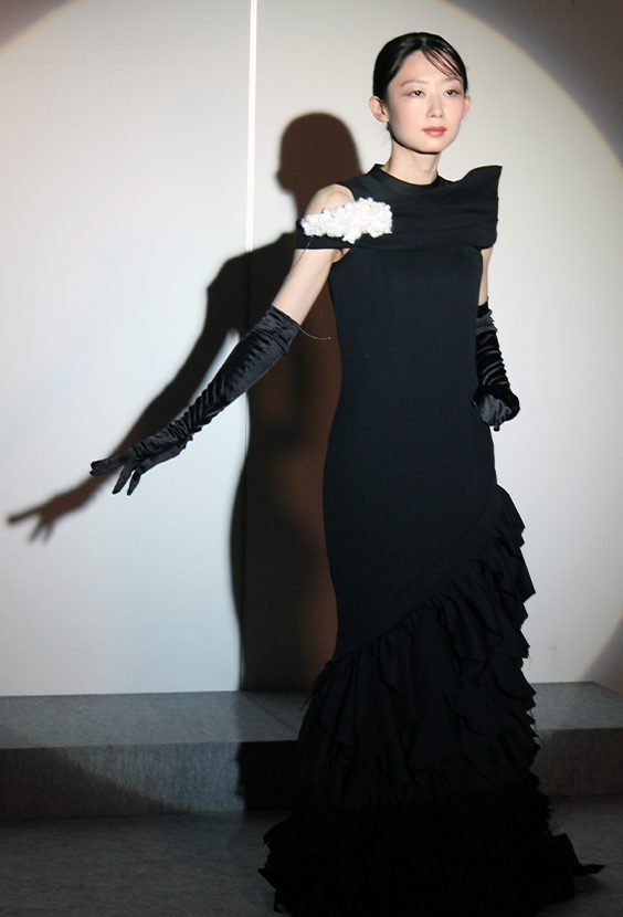 エレガントなマーメイドシルエットのドレス。マットな質感の綿入りウールギャバジンと、土台にはカツラギを使用することで、重厚感と立体的なフォルムを両立させました。2年間で培った技術を凝縮した1着に仕上がりました。
